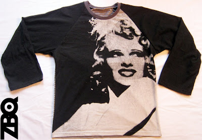 “Belle” by Thom Phoenix is a design based on an old photo of a burlesque dancer from the 1950s (not Marilyn Monroe as many people seem to think). This is a medium baseball shirt- 38 inch chest, 25 inch height. Shirt AD27.